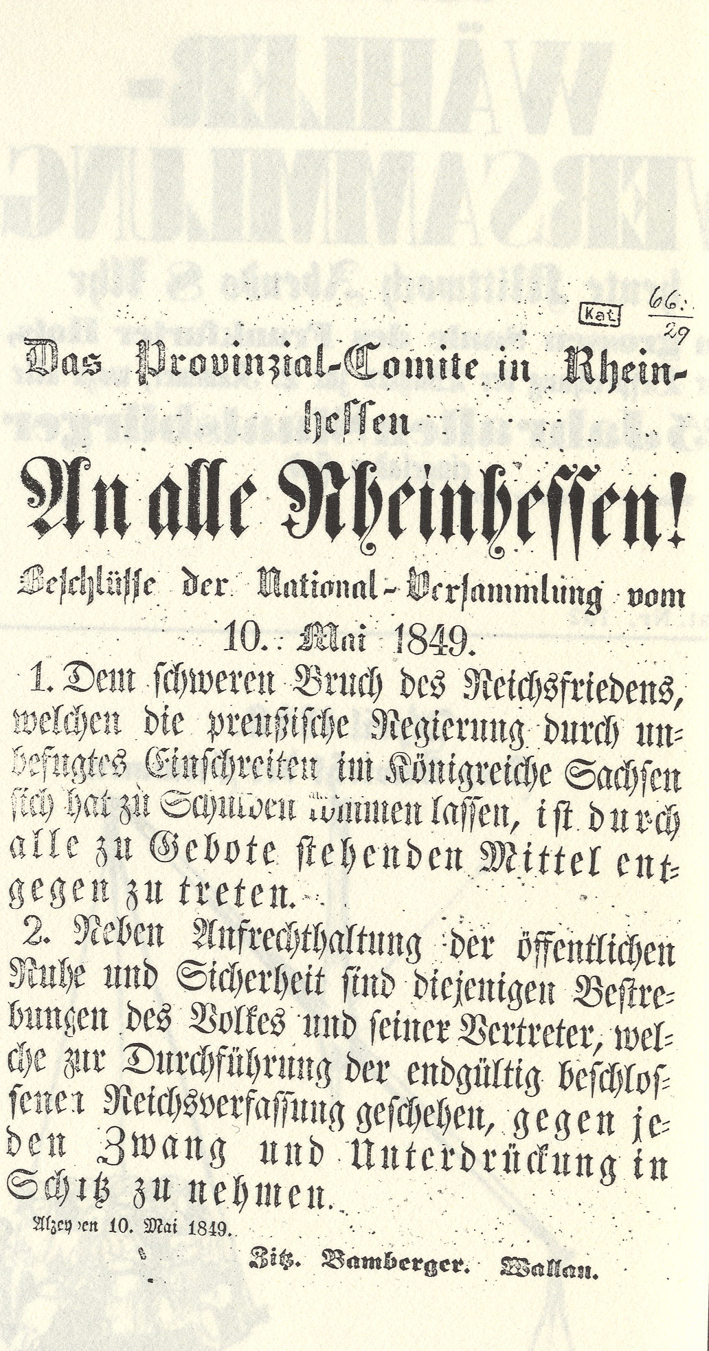 Das „Rumpfparlament“, das seinen Sitz nach Stuttgart verlegte, fasste den Beschluss, die Annahme der rechtsgültig verabschiedeten Reichsverfassung zu erzwingen. In der Pfalz beschlossen Volksversammlungen die Loslösung von Bayern, da die bayerische Staatsregierung sich weigerte, die Verfassung anzunehmen. Es wurden eine provisorische Regierung gebildet und ein Volksheer aufgestellt. Unterstützt wurden die Pfälzer durch rheinhessische Freischaren. Doch die „Reichsverfassungskampagne“ in der Pfalz und in Baden wurde von preußischen Truppen unter der Führung des Kronprinzen Wilhelm ("Kartätschenprinz") im Juni 1849 gewaltsam und blutig beendet.