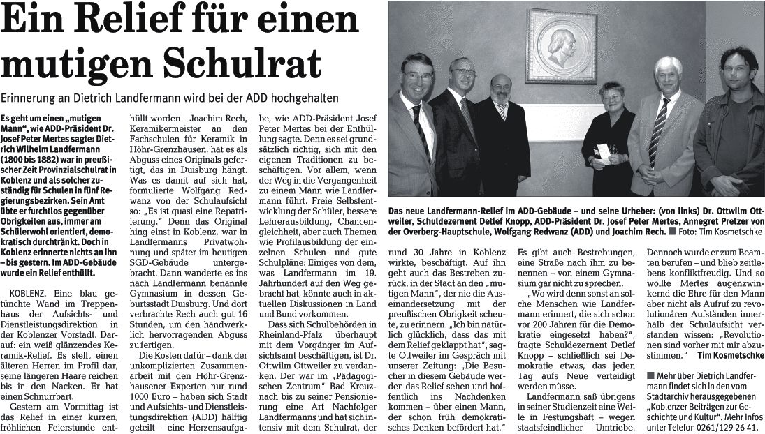 - Tim Kosmetschke, Ein Relief für einen mutigen Schulrat. In: Rhein-Zeitung Koblenz v. 20.08.2008, S. 13, Koblenz.