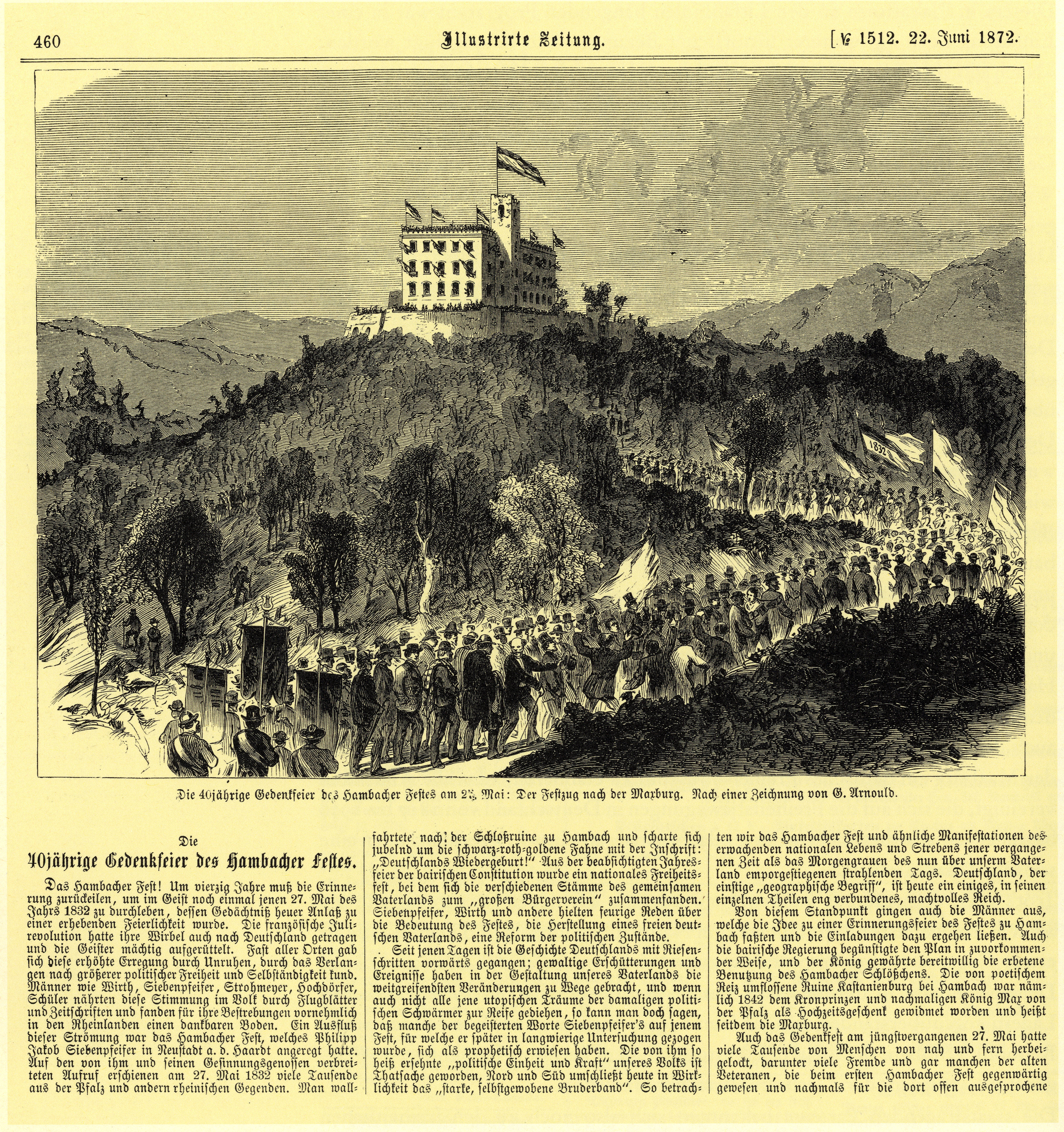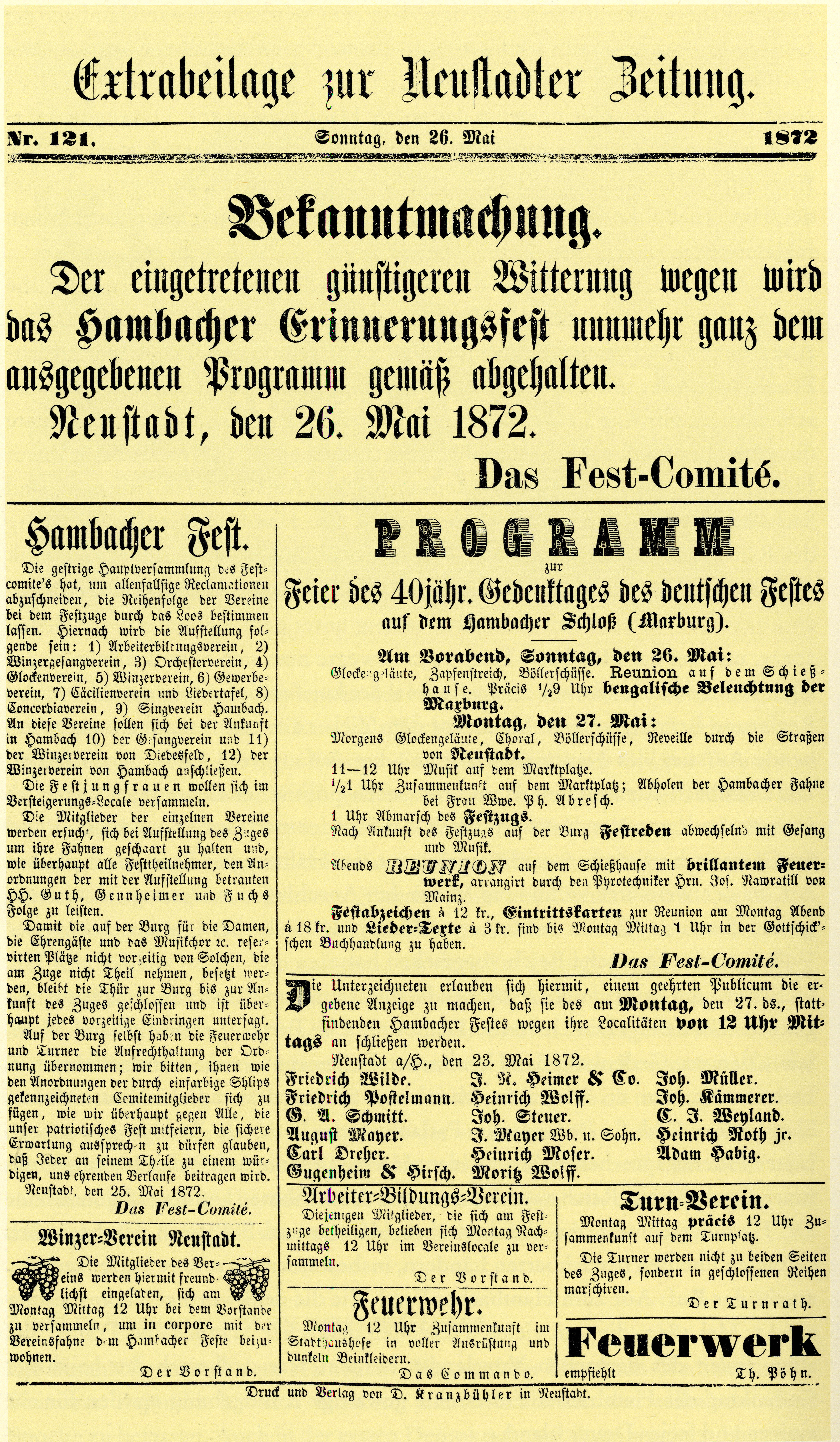 Die Gedenkfeier von 1872 stand ganz im Zeichen der deutschen Einheit, die im Jahr zuvor unter preußischer Vormachtstellung erreicht worden war. Während des Festumzuges zum Schloss wurden Schärpen und Fahnen in schwarz-weiß-rot getragen. Die Festredner huldigten dem „ruhmbekränzten deutschen Kaiser“ und König Ludwig II. von Bayern. Die demokratische und linksliberale Presse betitelte diese Form des Festjubiläums als „Geschichtsverfälschung“, da die Hambacher Volkssouveränität, Republik und Völkerfreundschaft gefordert hätten.